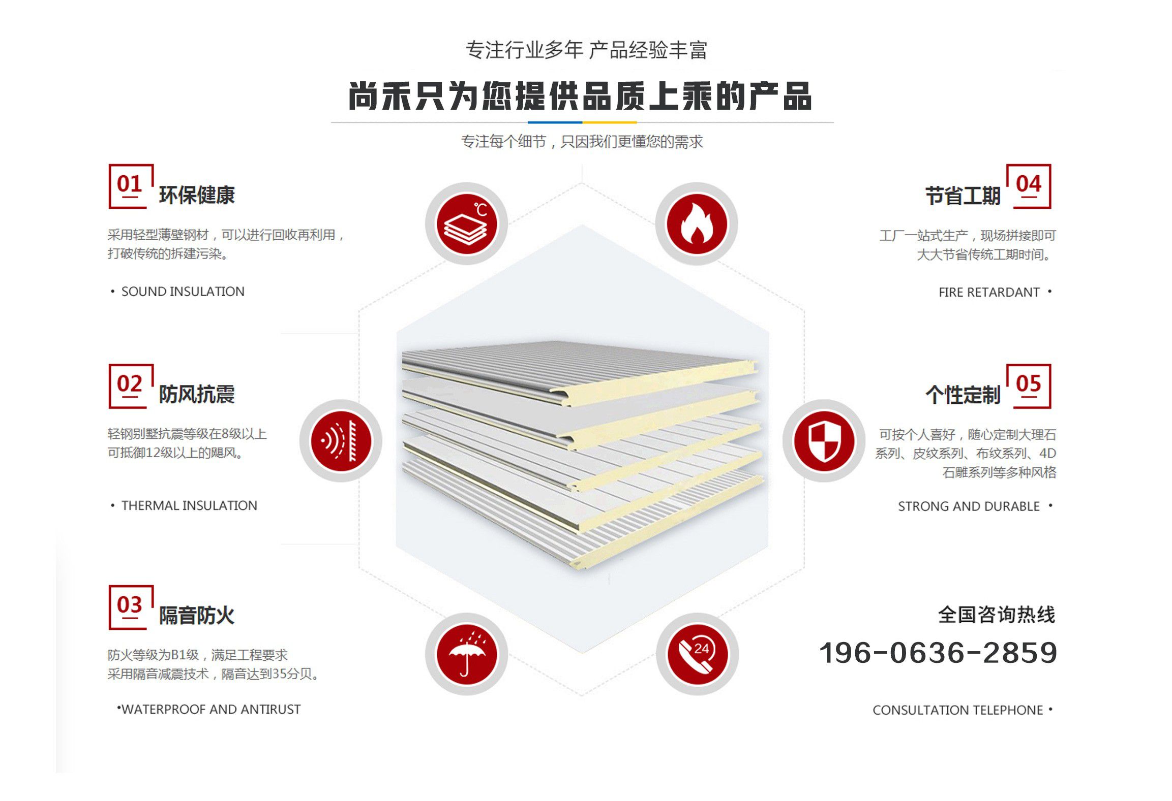 山東尚禾經貿有限公司是集板材設計、研發、生產、施工、一體化的科技公司,并在同行業中率先通過了質量、環境、安全管理體系認證。公司2011年投入資金2000余萬元引進世界先進的聚氨酯節能板連續生產線、意大利進口發泡系統,采用六組份在線自動操作混合澆注技術,在線一次性完成社會配料中心或工廠的配比混合工藝,并可以根據溫度在線自動調整,從而生產處與眾不同的高強度、節能型、綠色環保的聚氨酯夾芯板。(其使用年限高于同行業其他品牌5-10年)  公司主要經營范圍包括聚氨酯夾芯板,PU夾芯板,冷庫板,潔凈板,聚氨酯冷庫板,冷庫保溫板的設計、生產、銷售、技術指導、安裝及一體、以及進出口業務,是中部六省最大的綠色節能建材生產基地。聚氨酯夾芯板年產200萬平方米、PU夾芯板、冷庫保溫板500萬平方米、鏈整產業綜合實力,開創了六省至中西部創新型中小名企總部基地,并將著力推進中國中西部地區集成房屋住宅產業化發展進程?! 】萍紕撔隆⒐澞艿浞?。千萬間始終秉承“誠信、合作”的企業文化精髓,長期致力于鋼板材結構節能建筑產業,愿與社會各界攜手合作,共鑄綠色、環保美好未來。 產品具有良好的絕熱、阻燃、隔音、環保、耐久性能,可廣泛應用于工業、商用建筑內外墻、以及民用建筑外墻保溫、空調通風系統、專用防火保溫門等領域?! ∥覀兪冀K秉承...